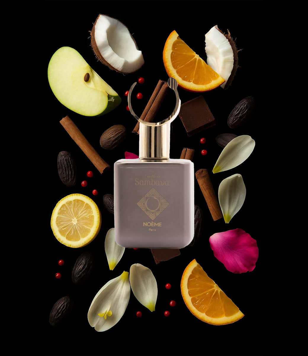 Contraste entre la noblesse des bois profonds et une overdose de notes baumées et cuirées. Comme un nuage enveloppant de matières rares qui définit l’identité Noème.